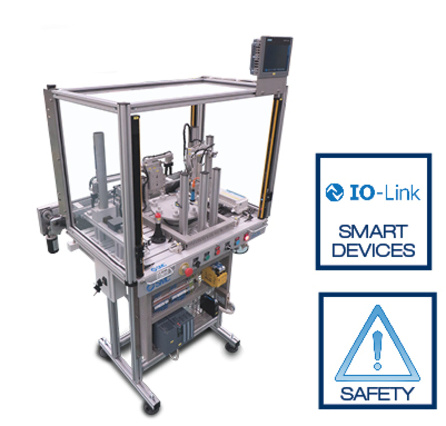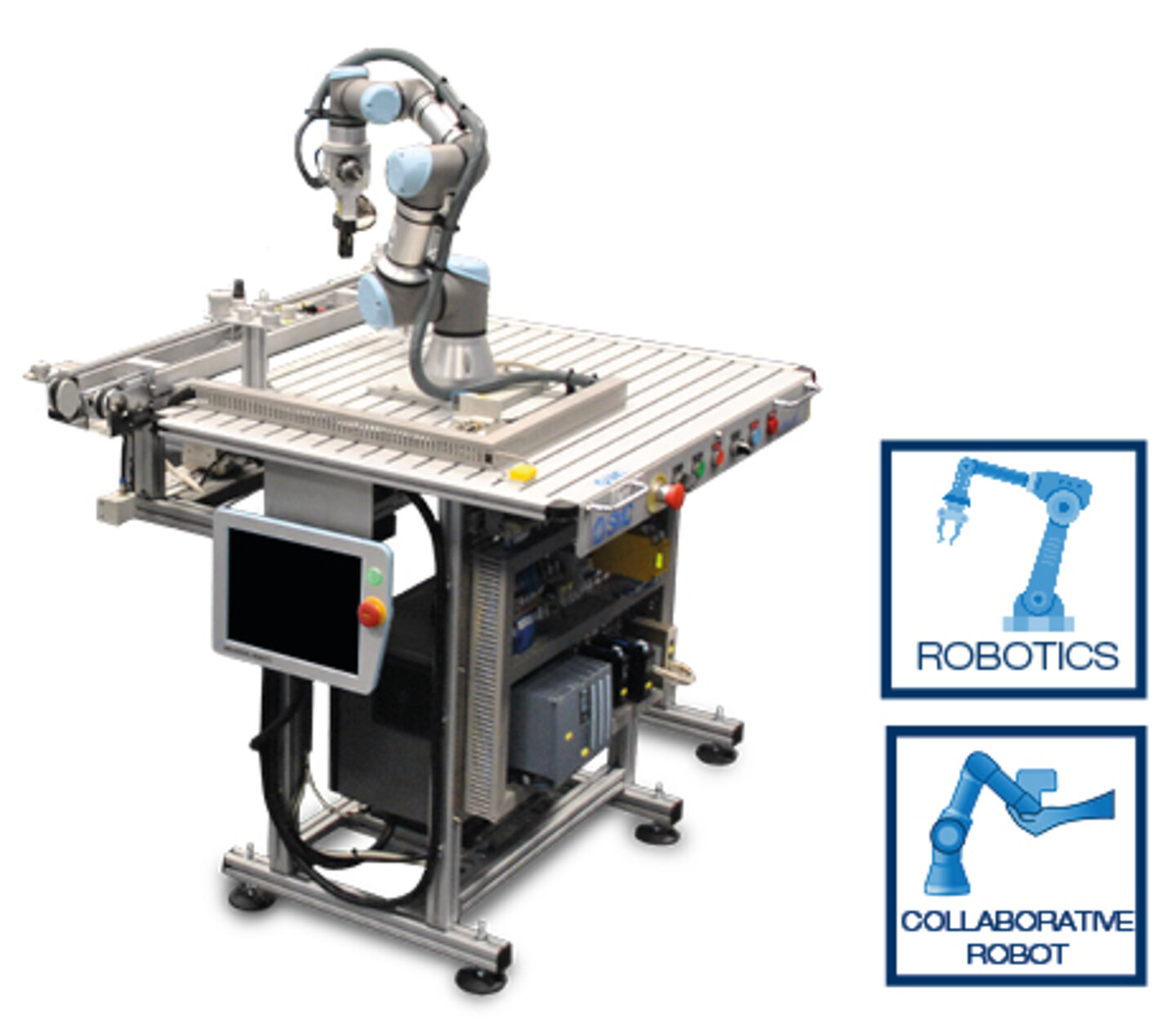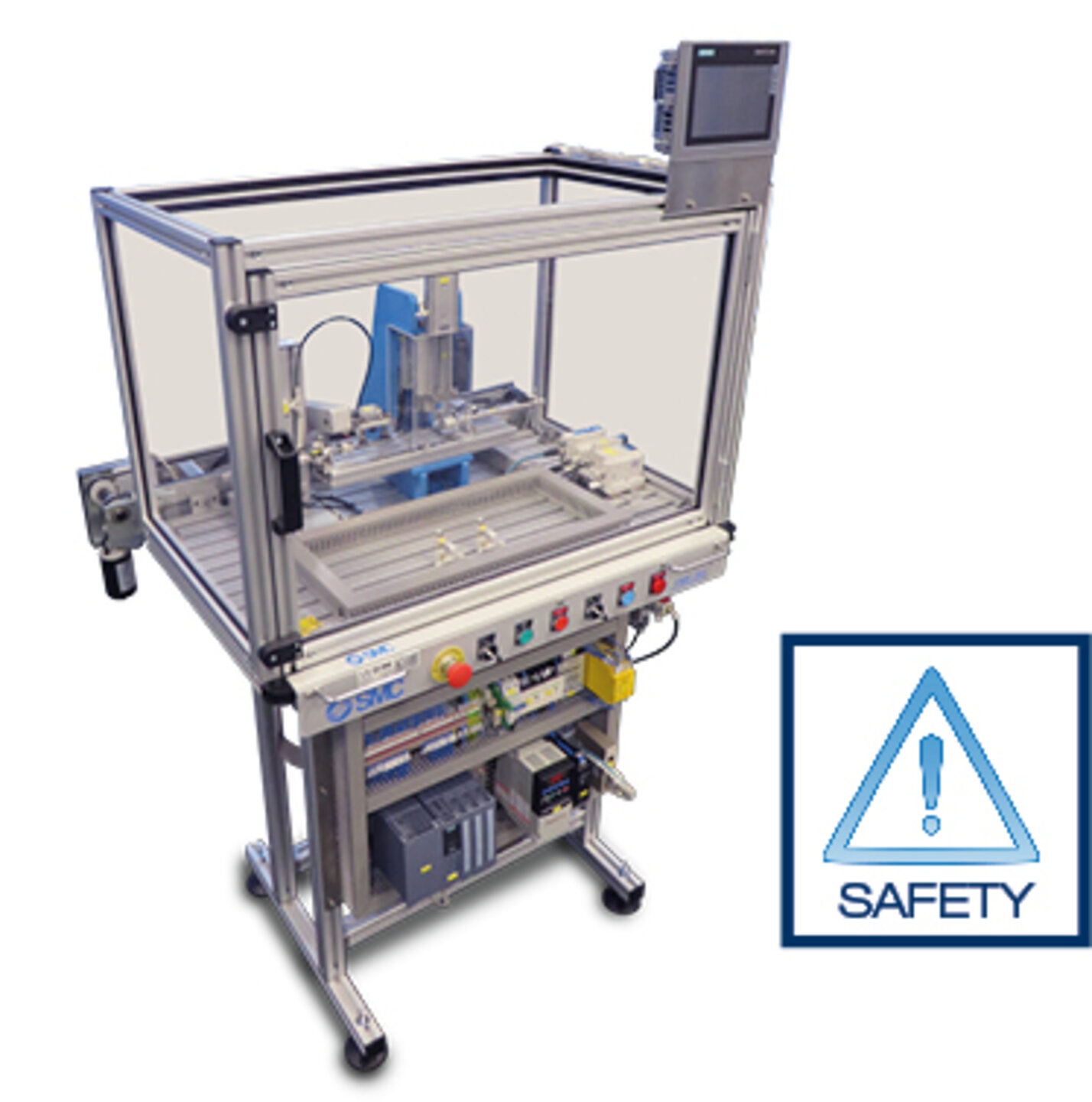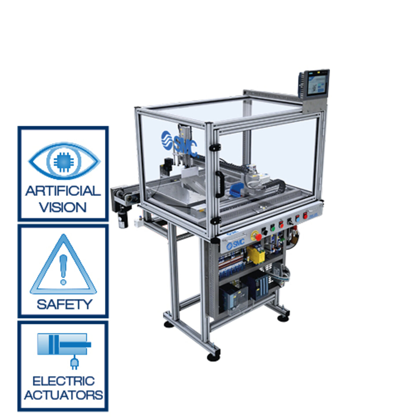 - Seguridad: con el fin de ofrecer conceptos de seguridad de maquinaria, se incorpora una guarda de protección transparente lateral y frontal, además de una cámara sensor de plano para la parte superior, que junto con el relé de seguridad permite trabajar la tecnología mencionada.