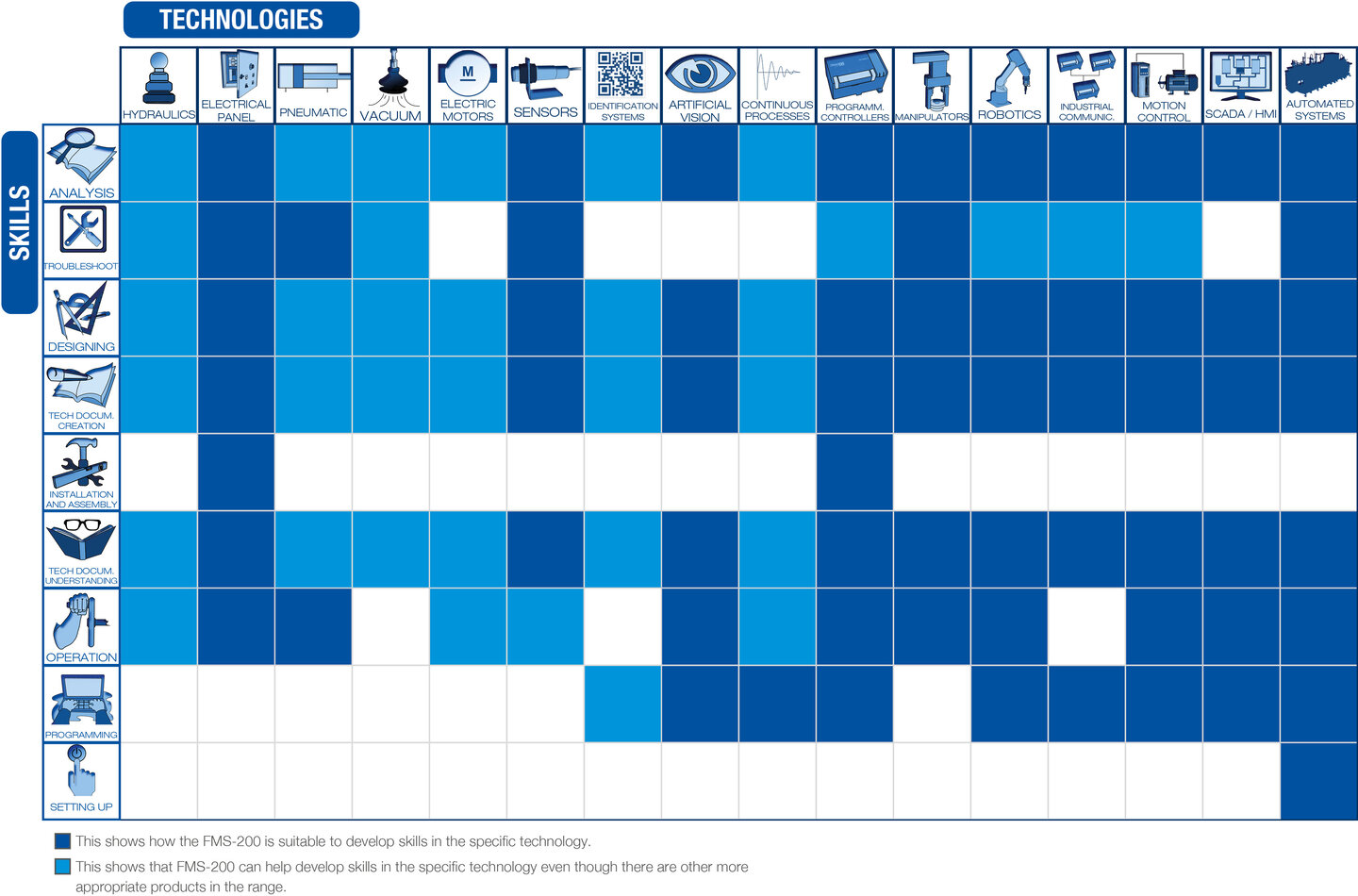 Integral training in industrial automation. The different process stations assemble a turning mechanism. To provide the system with greater flexibility, stations adapt to a wide variety of assemblies, introducing variations in the materials, colours and part sizes. The combination of all these possibilities means that a total of 24 different assemblies can be obtained enabling the use of production management strategies. The system includes a whole series of feeding, handling, verification and loading operations etc. carried out using components from different technologies (pneumatics, hydraulics, sensors, robotics, communications, control and HMI.).FMS-200 includes the breakdown simulation system which generates up to 16 different breakdowns to be diagnosed by the user.